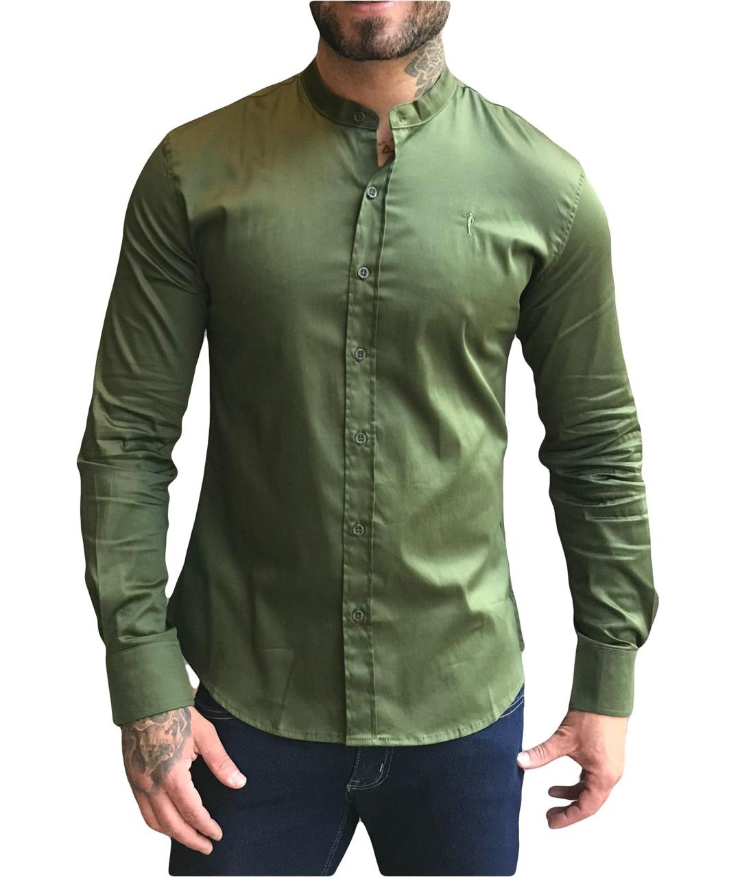 Camisa Slim Fit Gola Padre Acetinada Longa Verde Militar