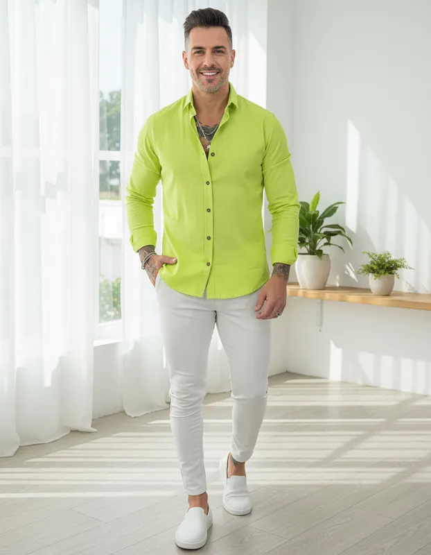 Camisa Masculina Linho Gola Italiana Per Pochi Verde Limao